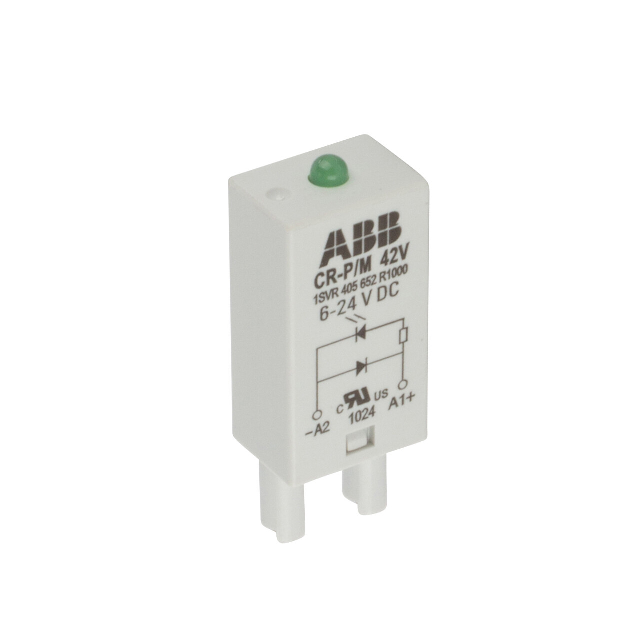 The CR-P/M 42V plug-in module is a pluggable function module for the CR-P and CR-M range sockets. This module provides reverse polarity protection/free wheeling diode and a green LED indication. The rated control supply voltage is 6-24 V DC.