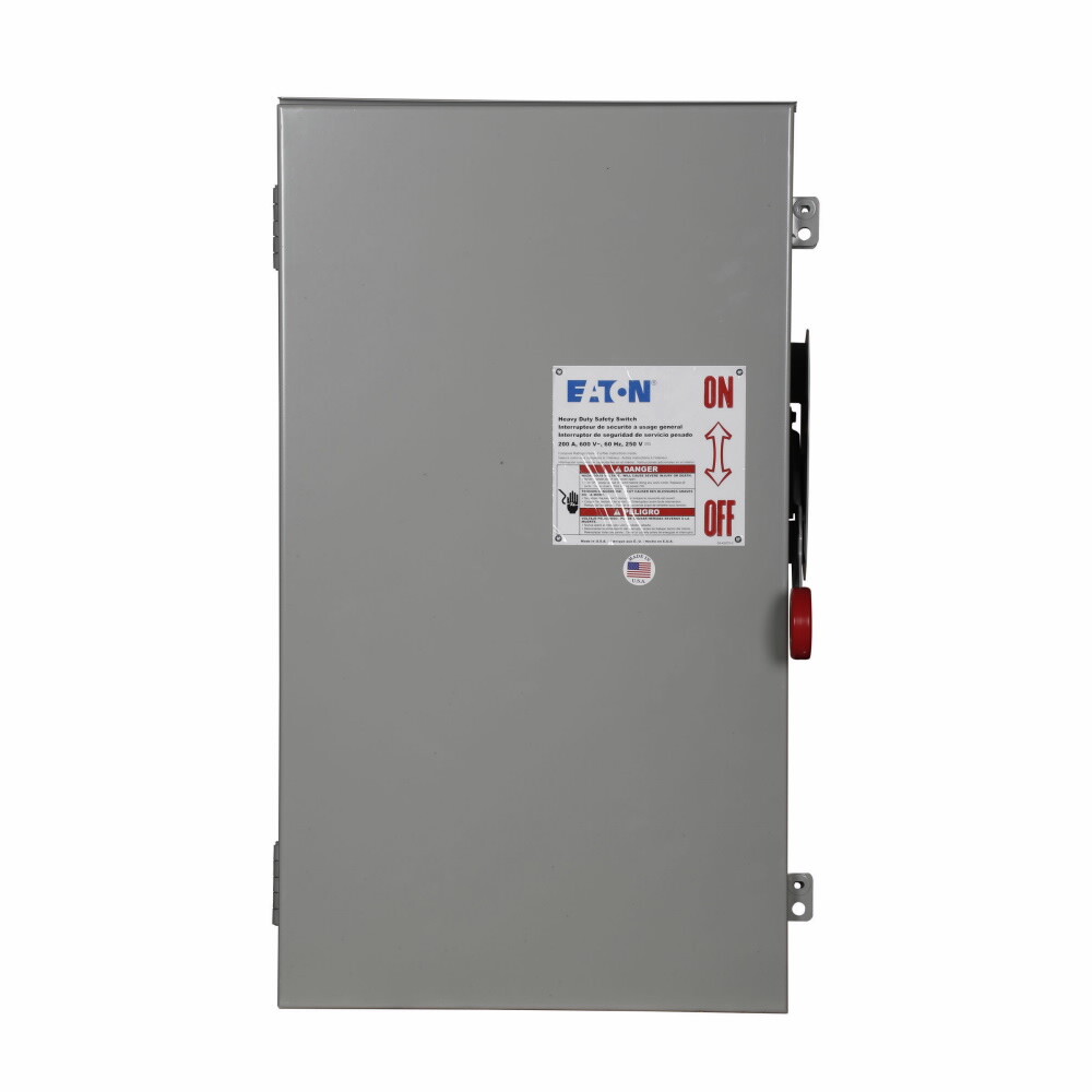 • Extended Description: Eaton Enhanced visible blade single-throw safety switch, 200 A, NEMA 3R, Painted galvanized steel, Class H, Fusible with neutral, Three-pole, Four-wire, 600 V, Max Hp: 50, 50/ 125, 150 hp (1/3PH @480, 600 V), #6-250 kcmil Cu/Al