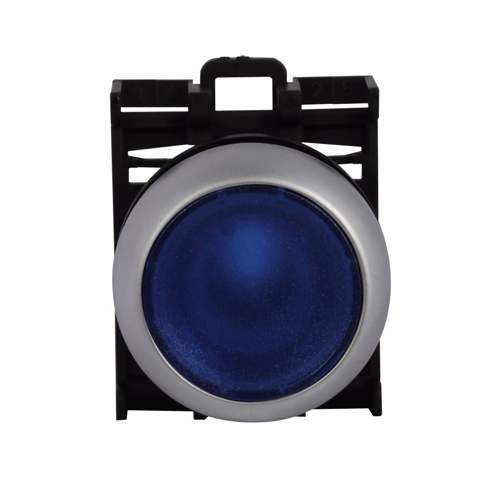 • Extended Description: Eaton M22 modular pushbutton, 22.5 mm, Flush, Momentary, Illuminated, Bezel: Silver, Button: Blue, IP67, IP69K, NEMA 4x, 13, 5,000,000 Million mechanical operations